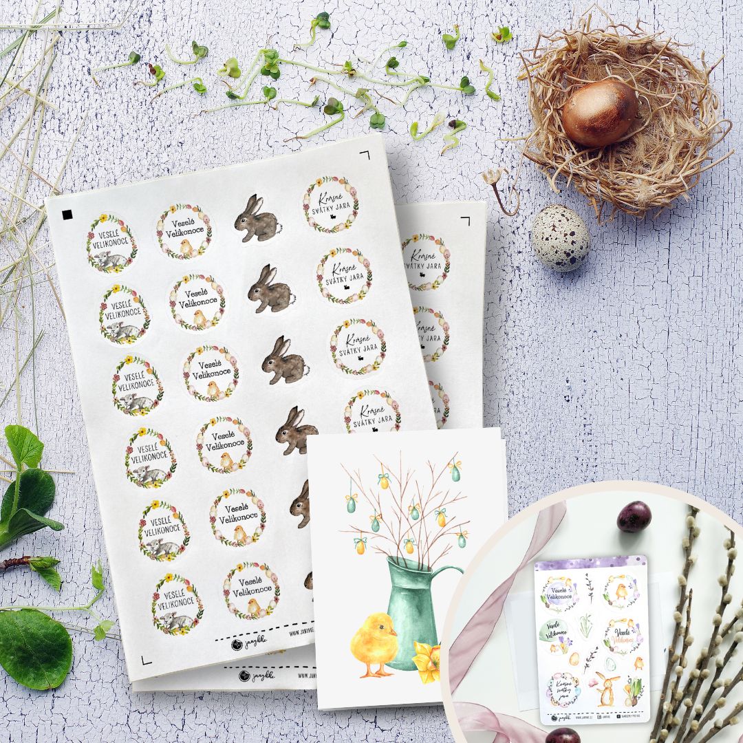 - velký arch: 2x 24 ks (cca 4 cm) – 6 přání svátků jara, 6 králíčků, 12 přání Velikonoc